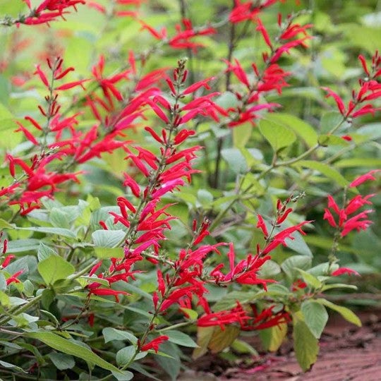 Pineapple sage grows long, scarlet-red flower spikes above a base of green-silver leaves. The flowers are loved by bees, hummingbirds, and butterflies. The plant tolerates poor soil as long as it is well-draining. The flowers are a bright addition to salads, beverages, and can be sugared and added on cakes. The leaves have a strong pineapple scent when bruised and can be used in drinks, teas, and cooking.